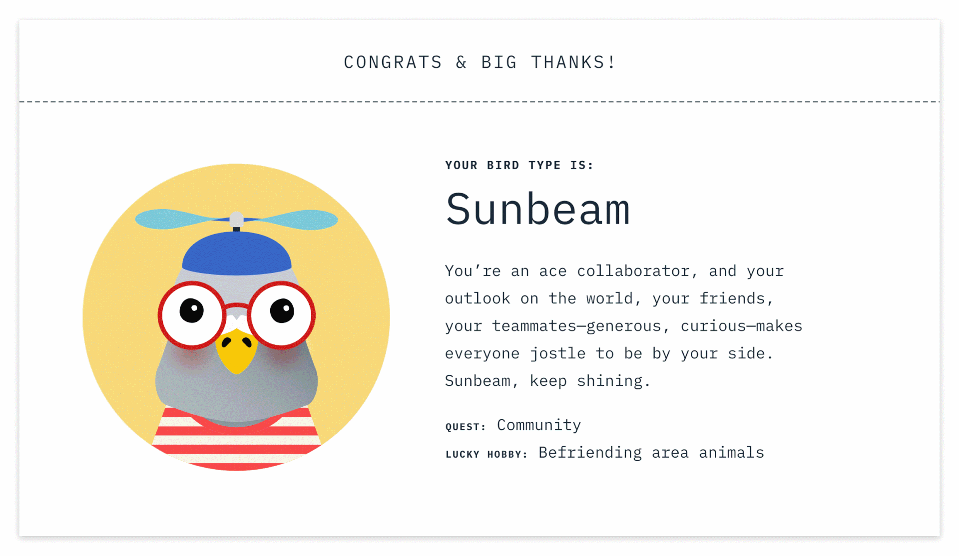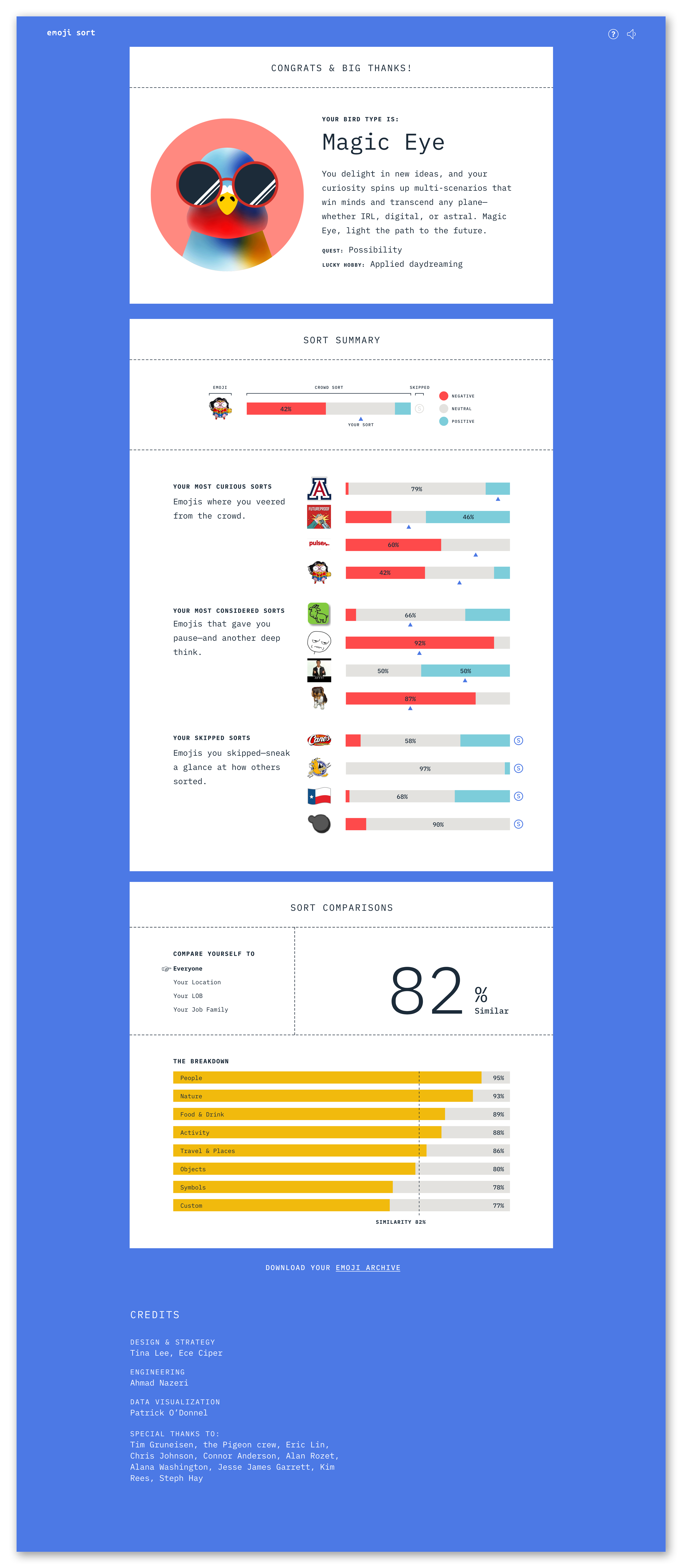 Finally, once a player is done sorting all emojis in the database, the game ends with a celebratory animation featuring Pigeon the Slack bot, and leads to a "Mood Review", an interactive results and stats page, where the player's bird type is revealed.