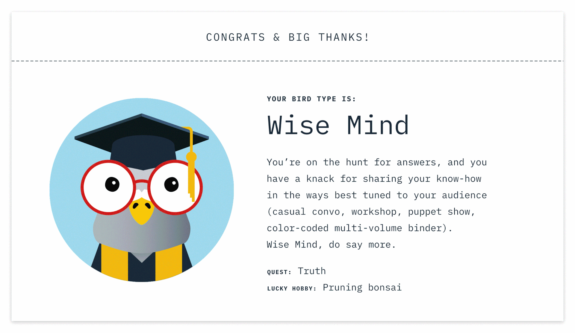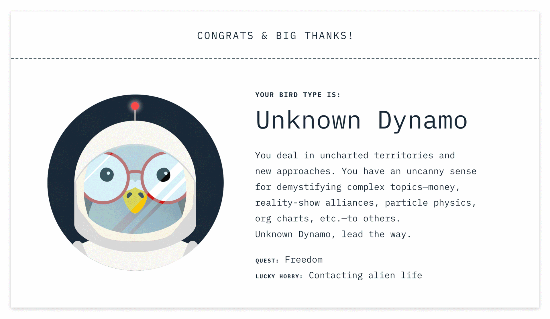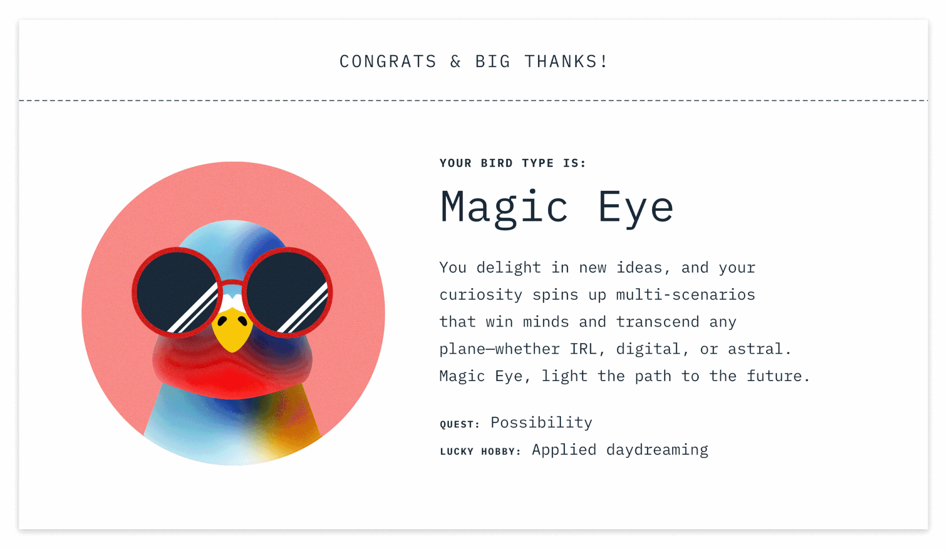 At the end of Emoji Sort, players meet their bird type. Each player is assigned a bird based on how their responses compare to the larger group and the time they took to sort emojis.
