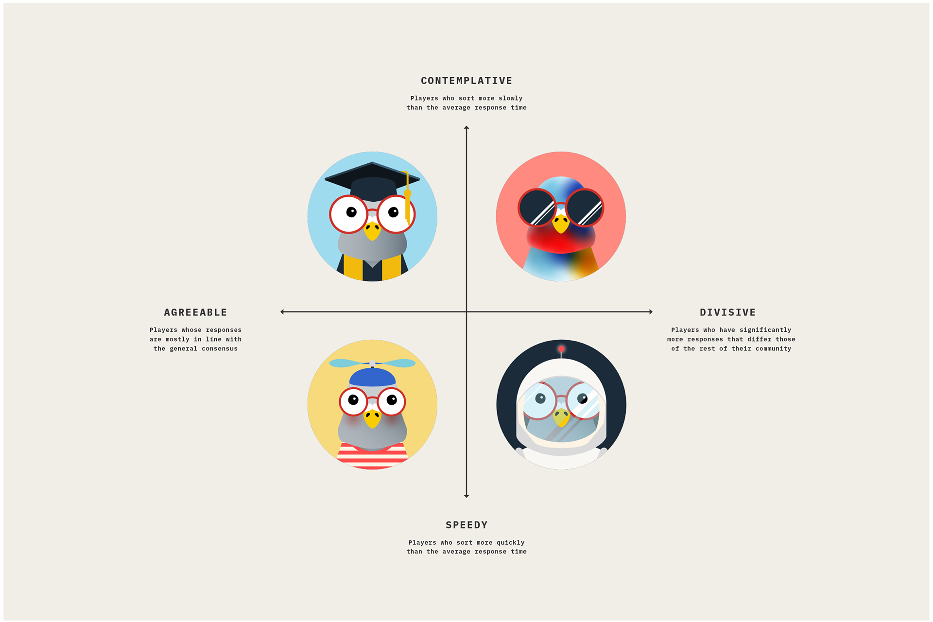 Building on the original Pigeon character (also designed by me), these characters were created referencing the 12 Jungian archetypes, and are based on a matrix with one axis representing the nature of the player’s answers–divisive vs agreeable relative to the larger pool of players; and the other axis representing their response time.