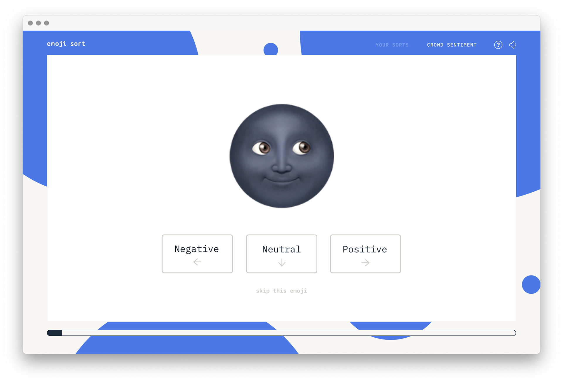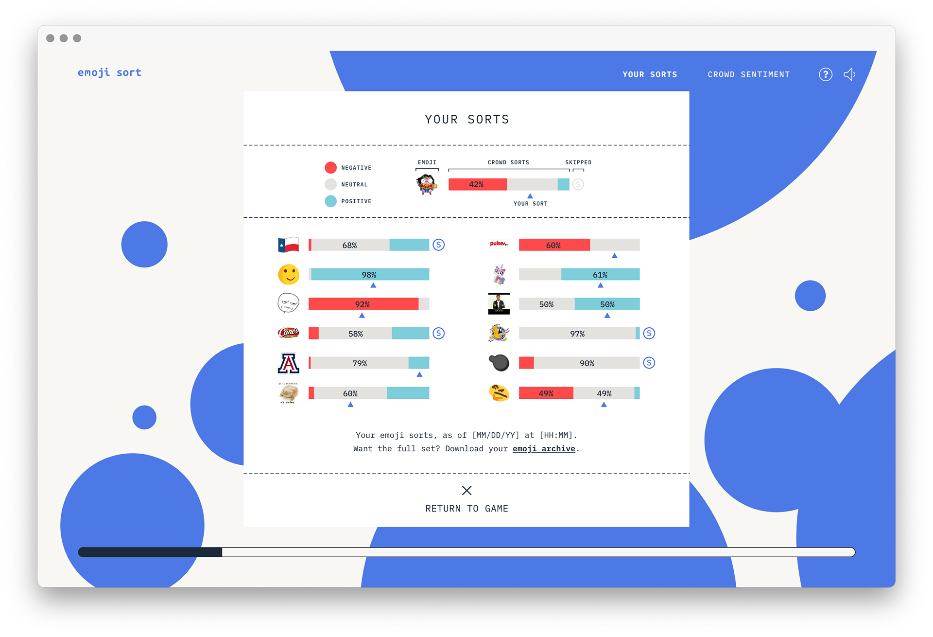 Once a small percentage of emojis are sorted, players can review their sorts and how their responses compare to those of other players', at any point during the game.