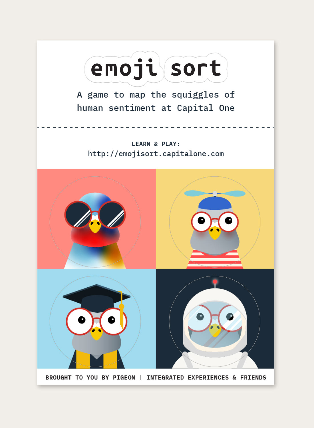 Marketing for Emoji Sort was necessary in order to generate meaningful enough data. Many of our coworkers adorn their laptops with custom stickers, once could say there is sticker culture at Capital One. In addition to the announcements on online channels, as a way to draw players in, we distributed some sticker sheets at our offices across the country.